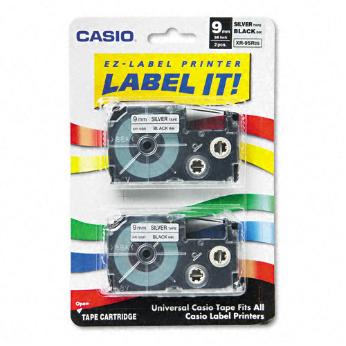 The Casio CAS-XR-9SR2S tape comes in a package of two, with each tape measuring 9mm. The tape is black on silver, providing clear and easy-to-read labels. This high-quality tape is perfect for labeling various items in an office or home setting. Make organizing and labeling a breeze with the Casio CAS-XR-9SR2S tape.